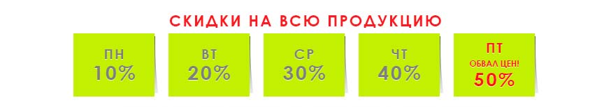 Еще одним приятным сюрпризом для посетителей являются скидки. Снижение цены происходит ежедневно, купить брендовую одежду можно еще дешевле. Посетив в понедельник магазин, вы получаете 10% скидку на весь ассортимент товаров. С каждым днем бонусы увеличиваются еще на десять процентов. Параллельно даются скидки на продукцию стоимостью от ста рублей и ниже. В соответствии с днями недели одежда со скидкой становится доступна каждому.